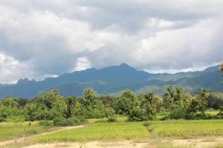 ฉากการสู้รบในหนัง ทัพหงสากำลังจะเข้าตีเมืองอโยธยา เห็นคันนาบ้านสันกลาง และดอยช้างผาด่านมุมบนซ้าย
