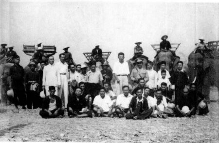ปรีดี พนมยง (ยืนกลาง) ขณะถ่ายทำหนังในปี 2483 ที่บ้านสันกลาง ตำบลป่าแดง จ.แพร่ /ภาพจากหอภาพยนตร์ (องค์การมหาชน)