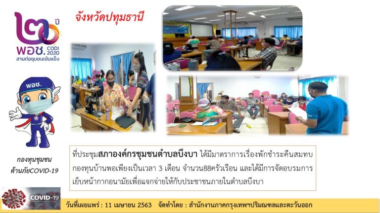 สภาองค์กรชุมชนตำบลบึงบา จ.ปทุมธานี มีมาตราการพักชำระคืนสมทบกองทุนบ้านพอเพียงพร้อมมอบหน้ากากอนามัย