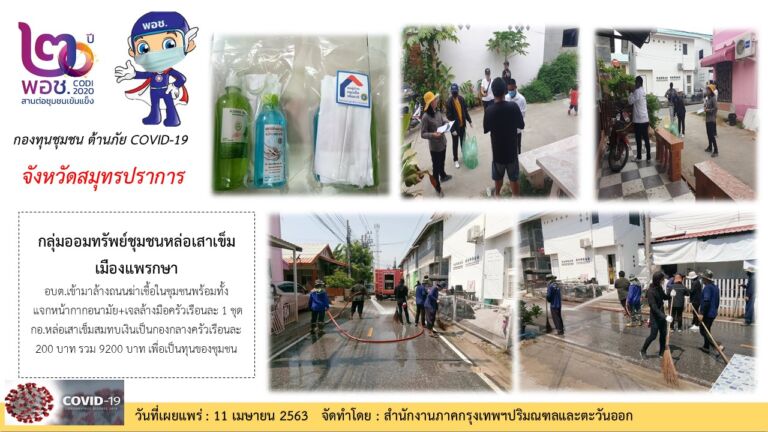 กลุ่มออมทรัพย์ชุมชนหล่อเสาเข็ม เมืองแพรกษา จังหวัดสมุทรปราการ ล้างถนนฆ่าเชื้อในชุมชนพร้อมทั้งแจกหน้ากากอนามัยและเจลล้างมือ