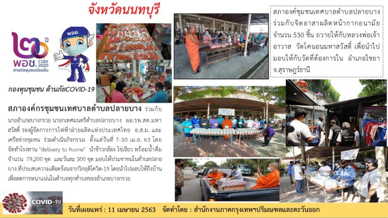 สภาองค์กรชุมชนเทศบาลตำบลปลายบาง จังหวัดนนทบุรี จัดทำโรงทาน “delivery to home” และผลิตหน้ากากอนามัย