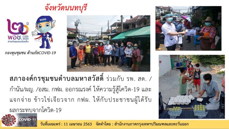 สภาองค์กรชุมชนตำบลมหาสวัสดิ์ จ.นนทบุรี ออกรณรงค์ ให้ความรู้สู้โควิด-19 และแจกจ่าย ข้าวไข่เจียวจาก กฟผ. ให้กับประชาชนผู้ได้รับผลกระทบจากโควิด-19