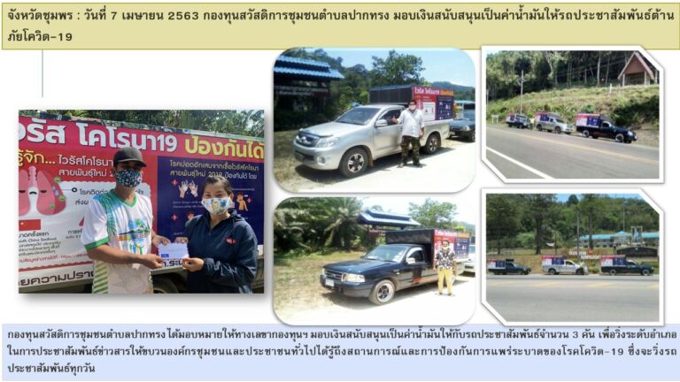 กองทุนสวัสดิการชุมชนตำบลปากทรง จ.ชุมพร มอบเงินสนับสนุนเป็นค่าน้ำมันให้รถประชาสัมพันธ์ต้านภัยโควิด-19