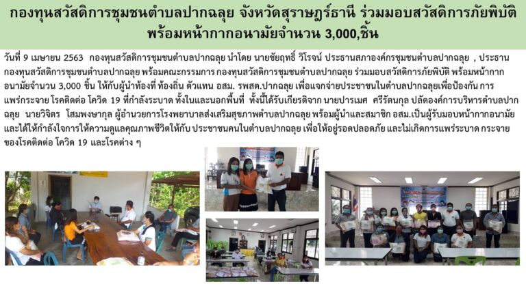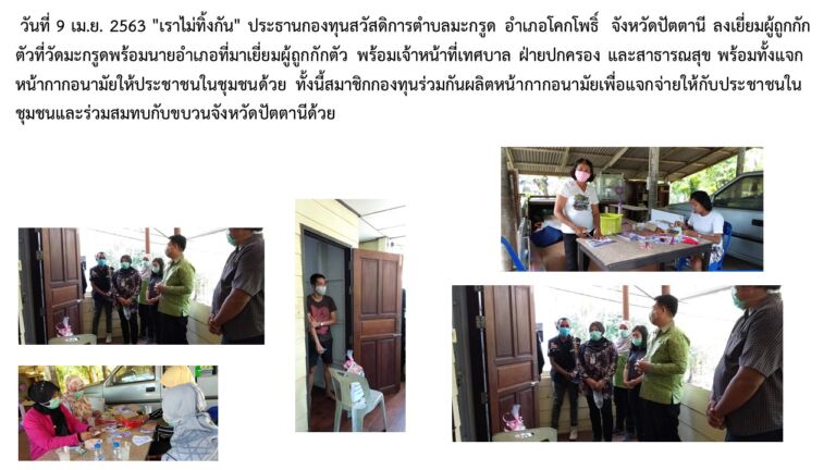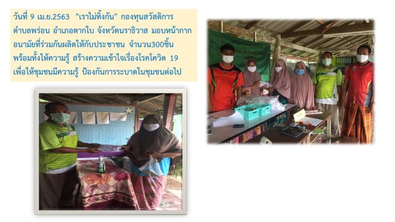 กองทุนสวัสดิการตำบลพร่อน อำเภอตากใบ จังหวัดนราธิวาส มอบหน้ากากอนามัยที่ร่วมกันผลิตให้กับประชาชน จำนวน300ชิ้น