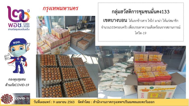 กลุ่มสวัสดิการชุมชนมั่นคง133 เขตบางบอน กรุงเทพฯ ได้แจกข้าวสาร ไข่ไก่ อาหารแห้ง ให้แก่สมาชิก บรรเทาความเดือดร้อนจากสถานการณ์โควิด-19