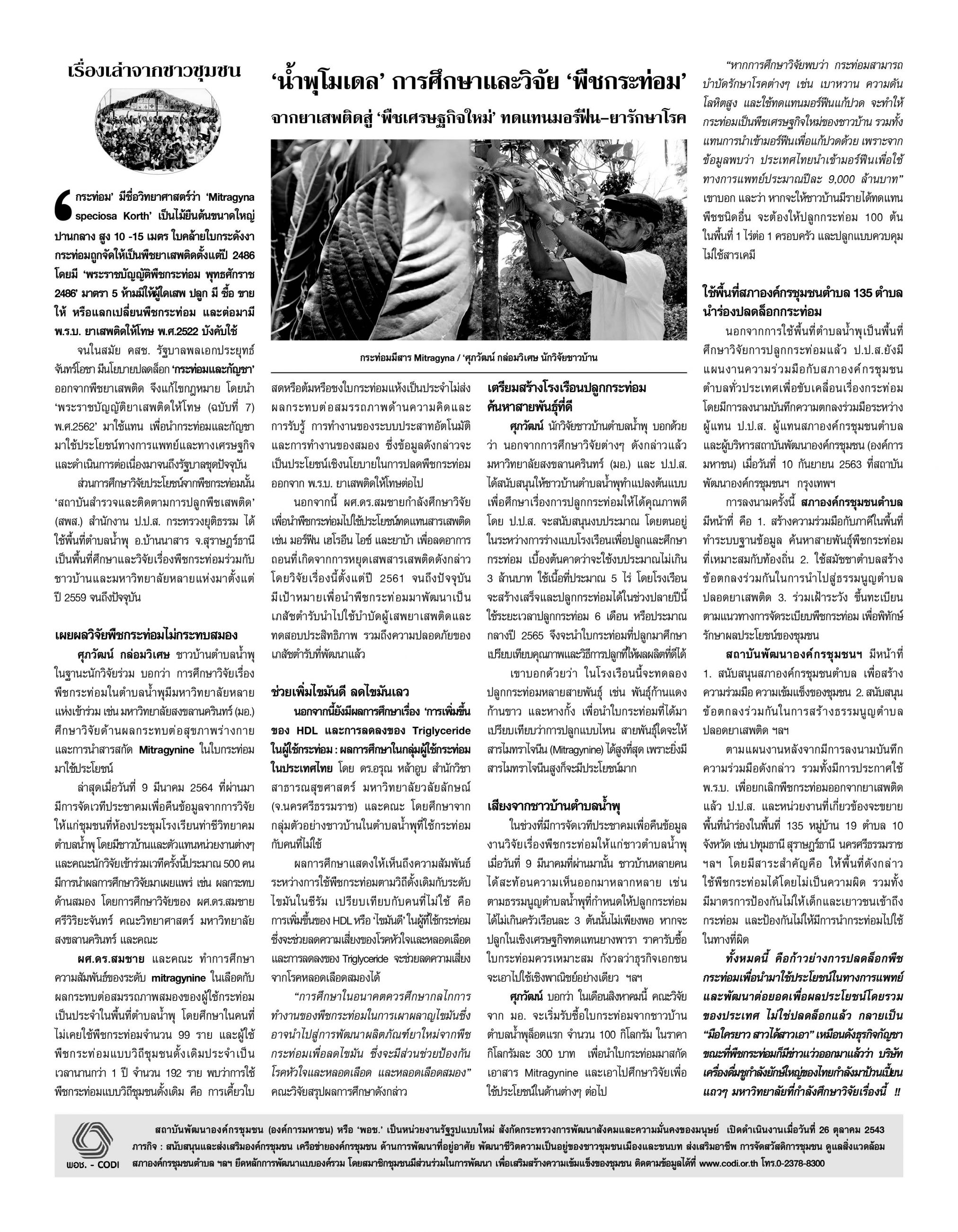 หนังสือพิมพ์ มติชน ฉบับวันที่ 30 เมษายน-6 พฤษภาคม 2564 เรื่องเล่าจากชุมชน “น้ำพุโมเดล” การศึกษาและวิจัย “พืชกระท่อม” จากยาเสพติดสู่ “พืชเศรษฐกิจใหม่” ทดแทนมอร์ฟีน-ยารักษาโรค